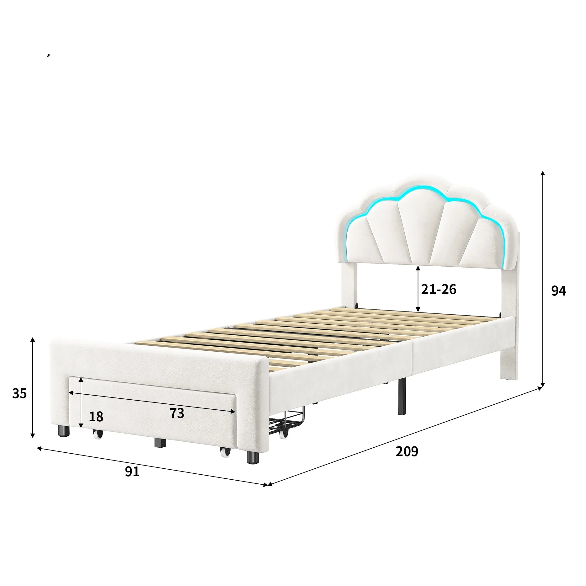 Un lit 1 place 90x200 pratique avec tiroir de rangement et une tête fleur lumineuse en velours.