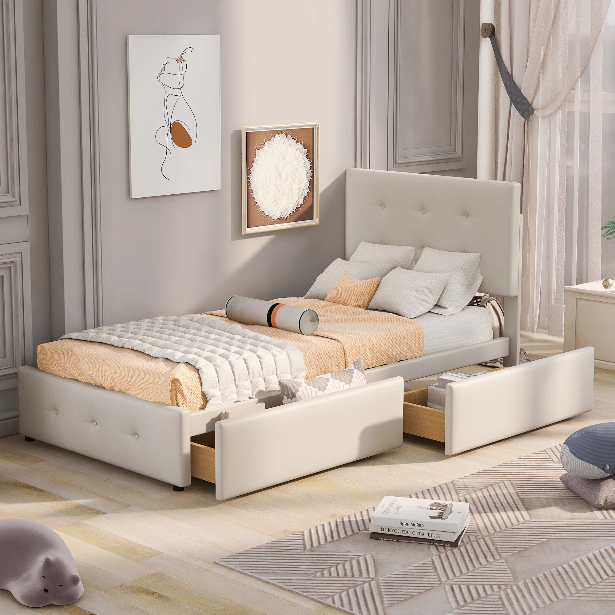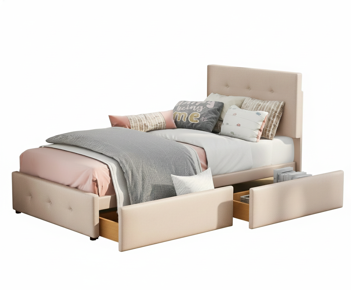 La tête de lit capitonnée et le cadre rembourré créent un look moderne et chaleureux. Les tiroirs intégrés, discrets et faciles à manipuler, ajoutent une véritable valeur pratique. Disponible en rose, beige ou gris, ce lit s’intègre dans des décors scandinaves, modernes ou classiques.
