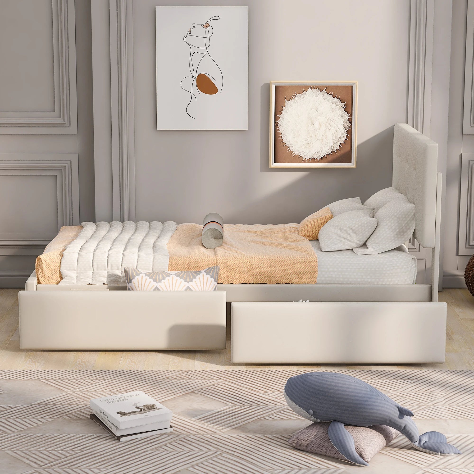 Un lit 1 place 90x200 élégant et pratique avec deux tiroirs sur roulettes pour optimiser le rangement.