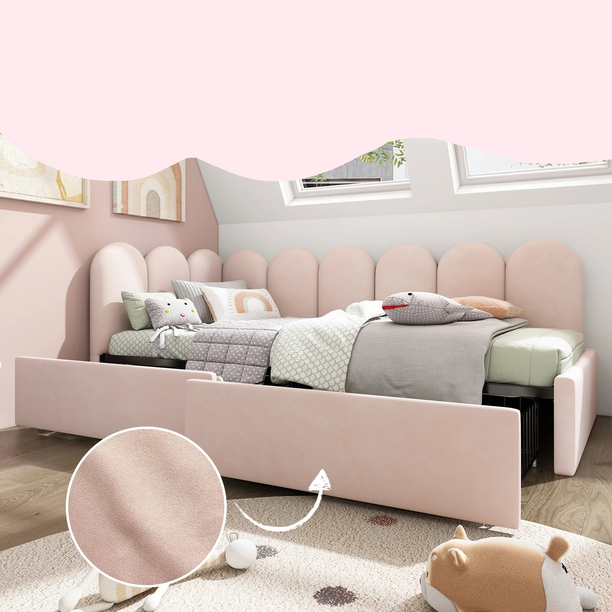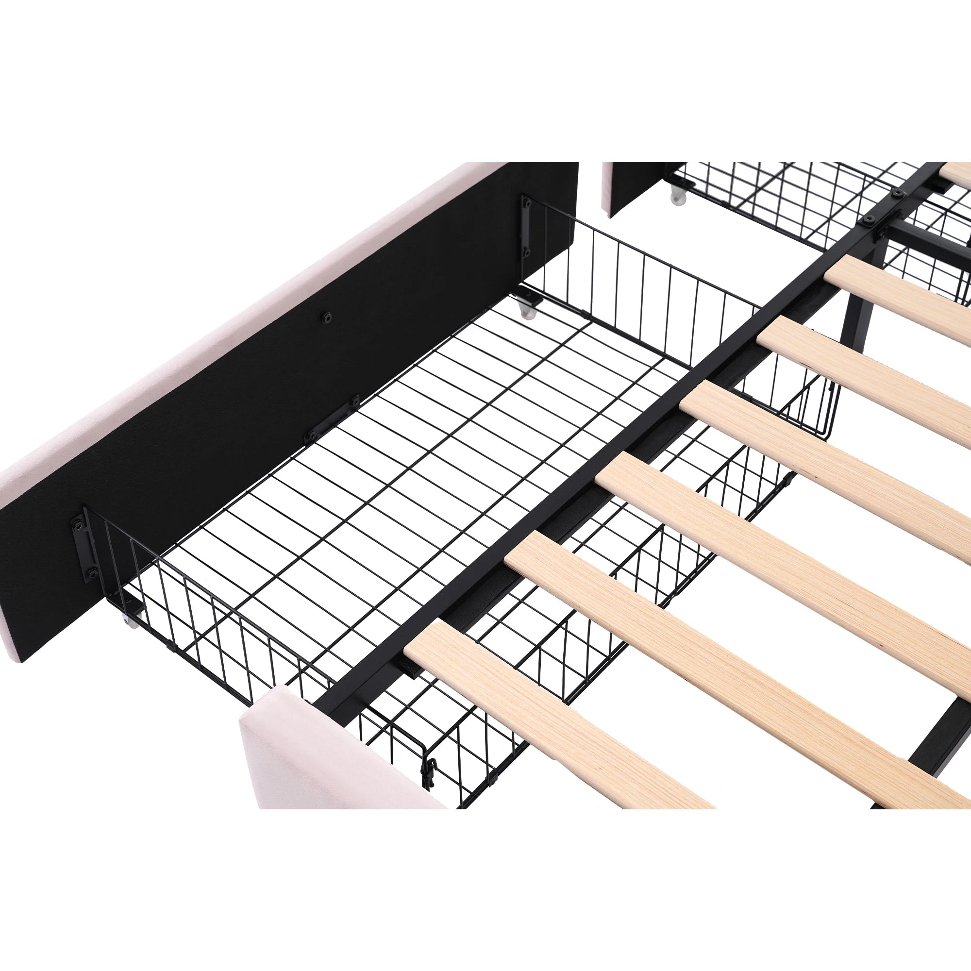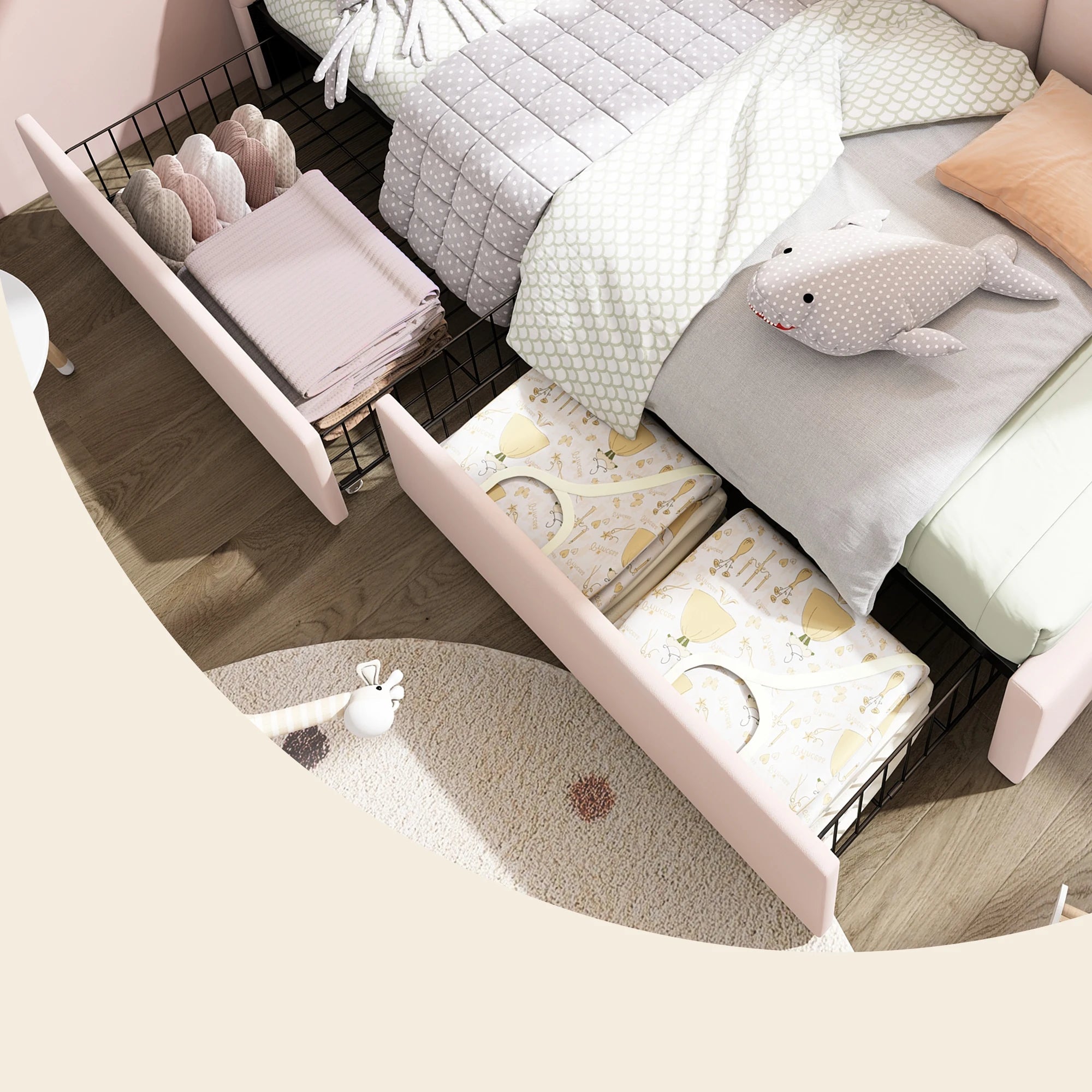 Deux paniers métalliques intégrés sous le cadre offrent un véritable lit 1 place avec rangement, idéal pour organiser les jouets, le linge ou les accessoires. Le lit peut donc remplacer un lit simple classique, un canapé-lit dans les petits espaces.