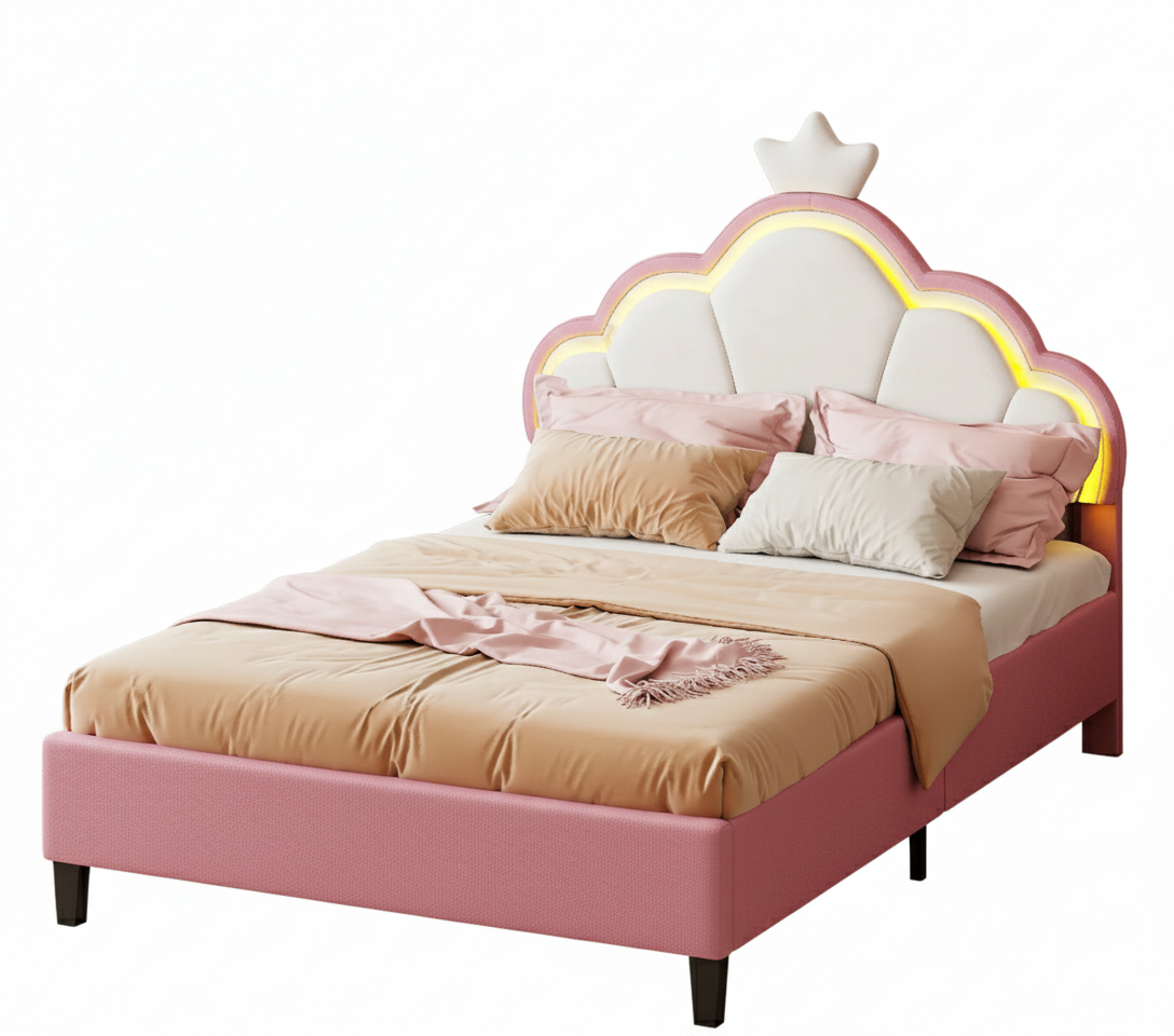 Le design princesse, avec sa tête de lit couronne rétroéclairée LED, crée une ambiance chaleureuse et rassurante. Ce style décoratif en fait aussi une alternative élégante aux modèles aux lits plus simples, tout en restant dans une catégorie lit 2 places pas cher mais qualitative.