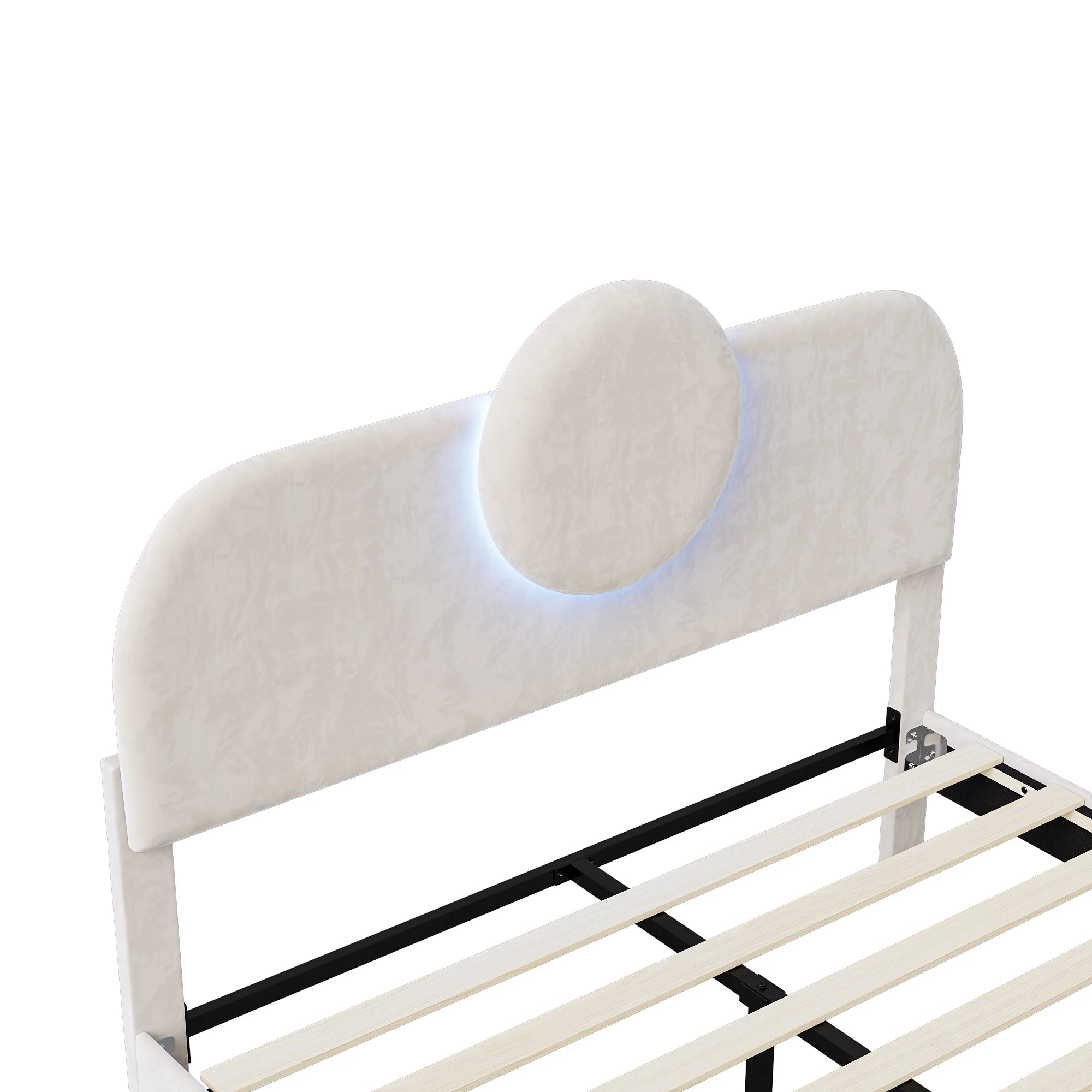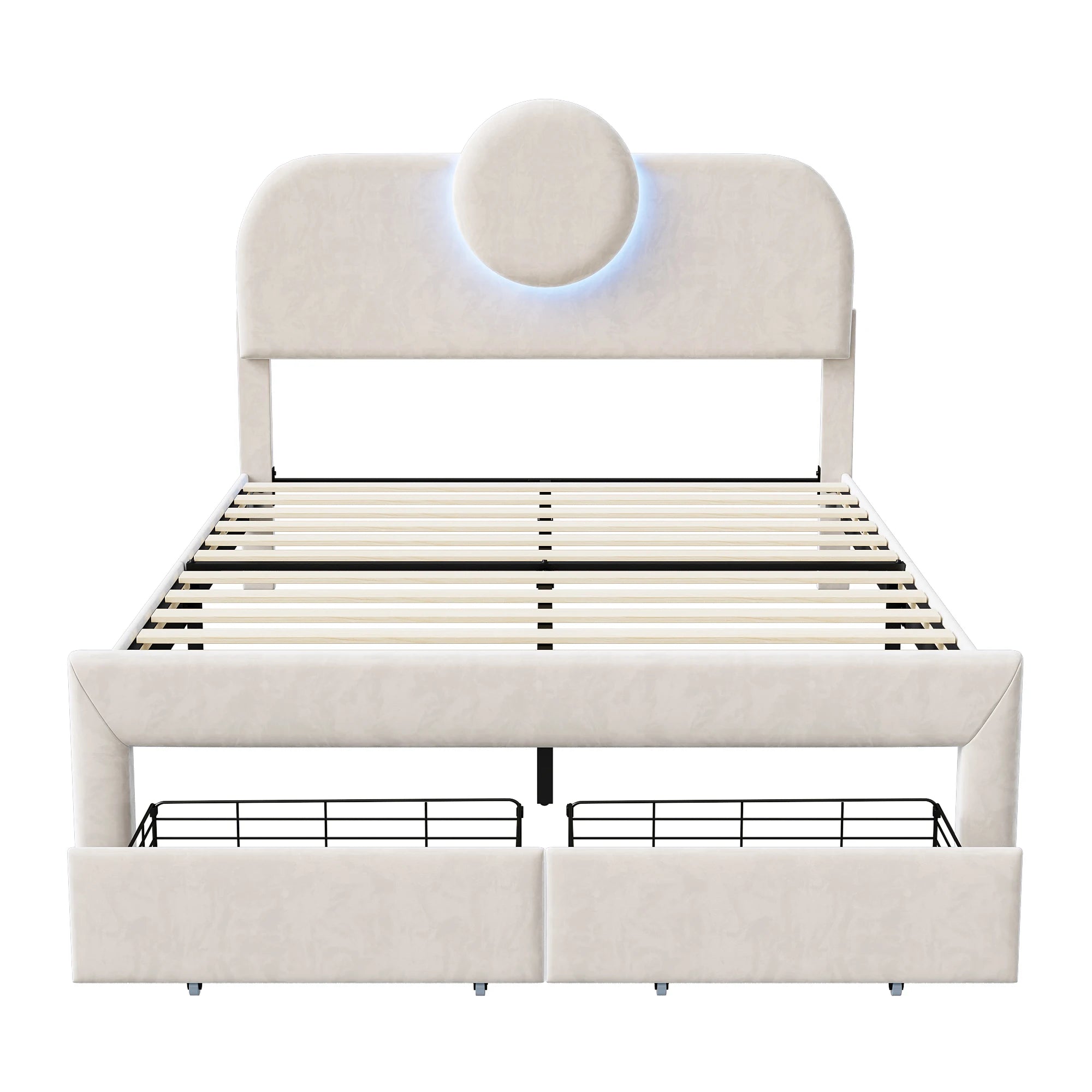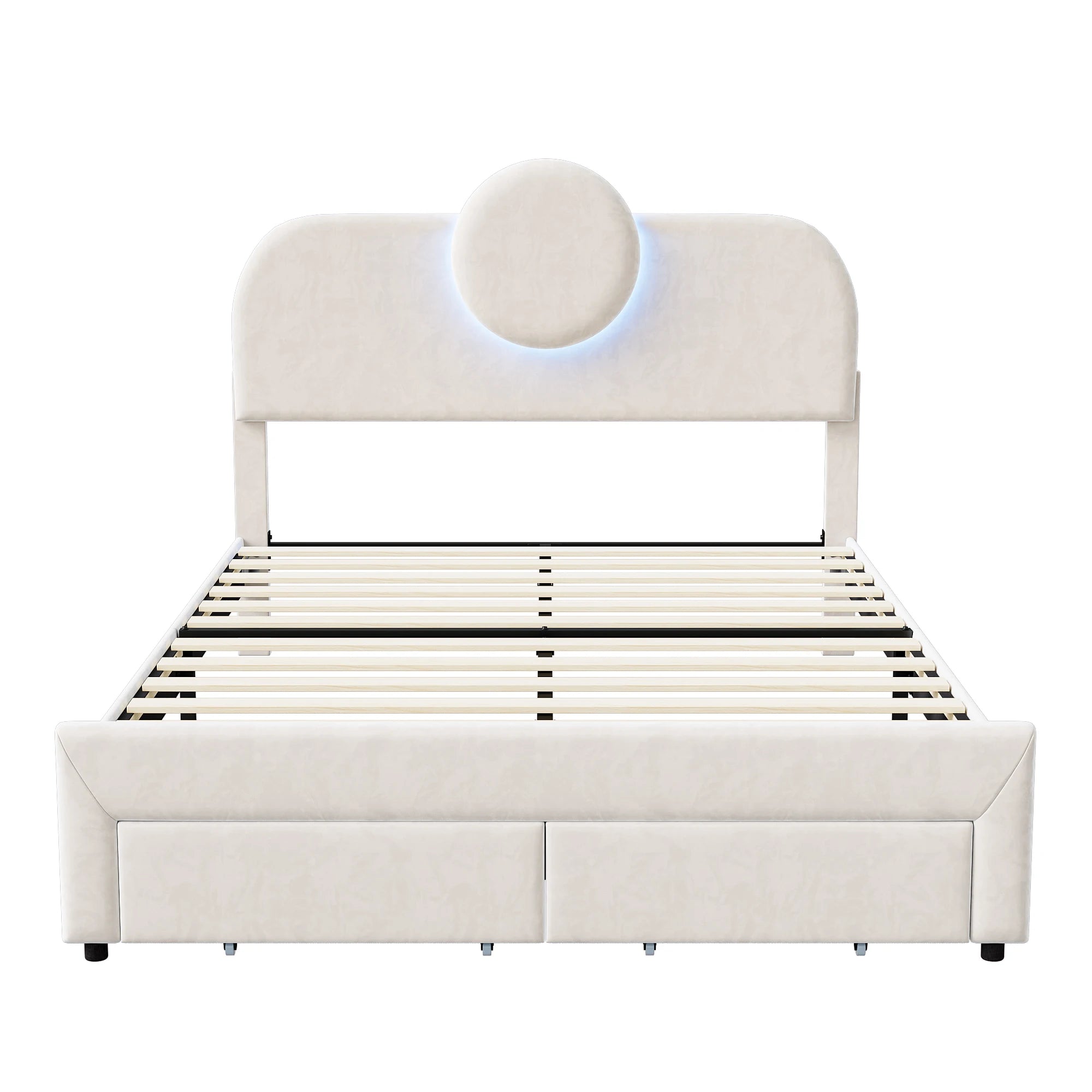 La tête de lit, avec son cercle LED intégré, apporte une touche moderne et crée une ambiance douce et chaleureuse. Ce lit devient un véritable point focal dans la chambre, tout en restant facile à intégrer dans une décoration contemporaine. Grâce à ses tiroirs à roulettes, il remplit aussi parfaitement le rôle d’un lit 2 places avec tiroir, pratique au quotidien.