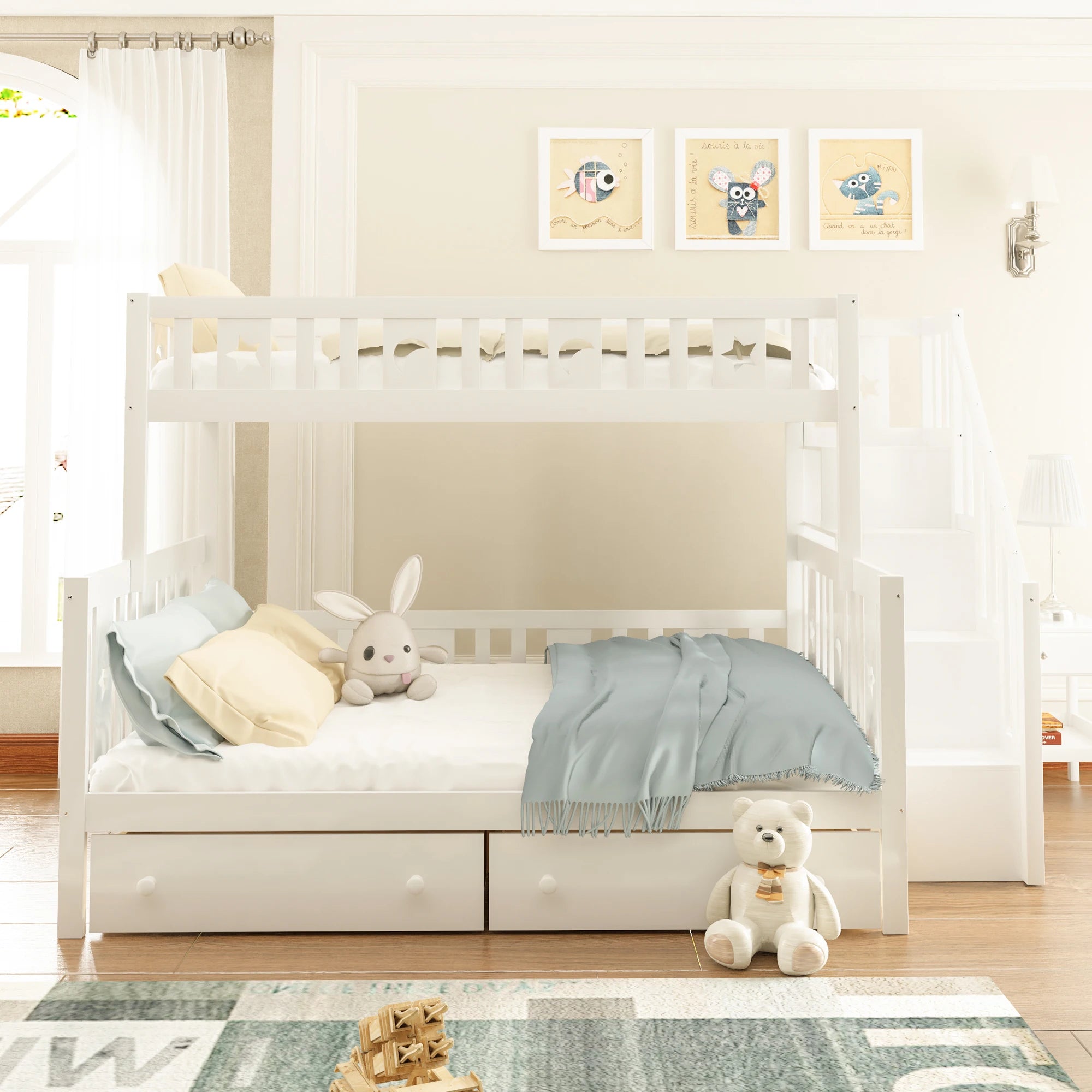 Un lit cabane superposé sécurisé avec escalier de rangement pour optimiser l’espace.