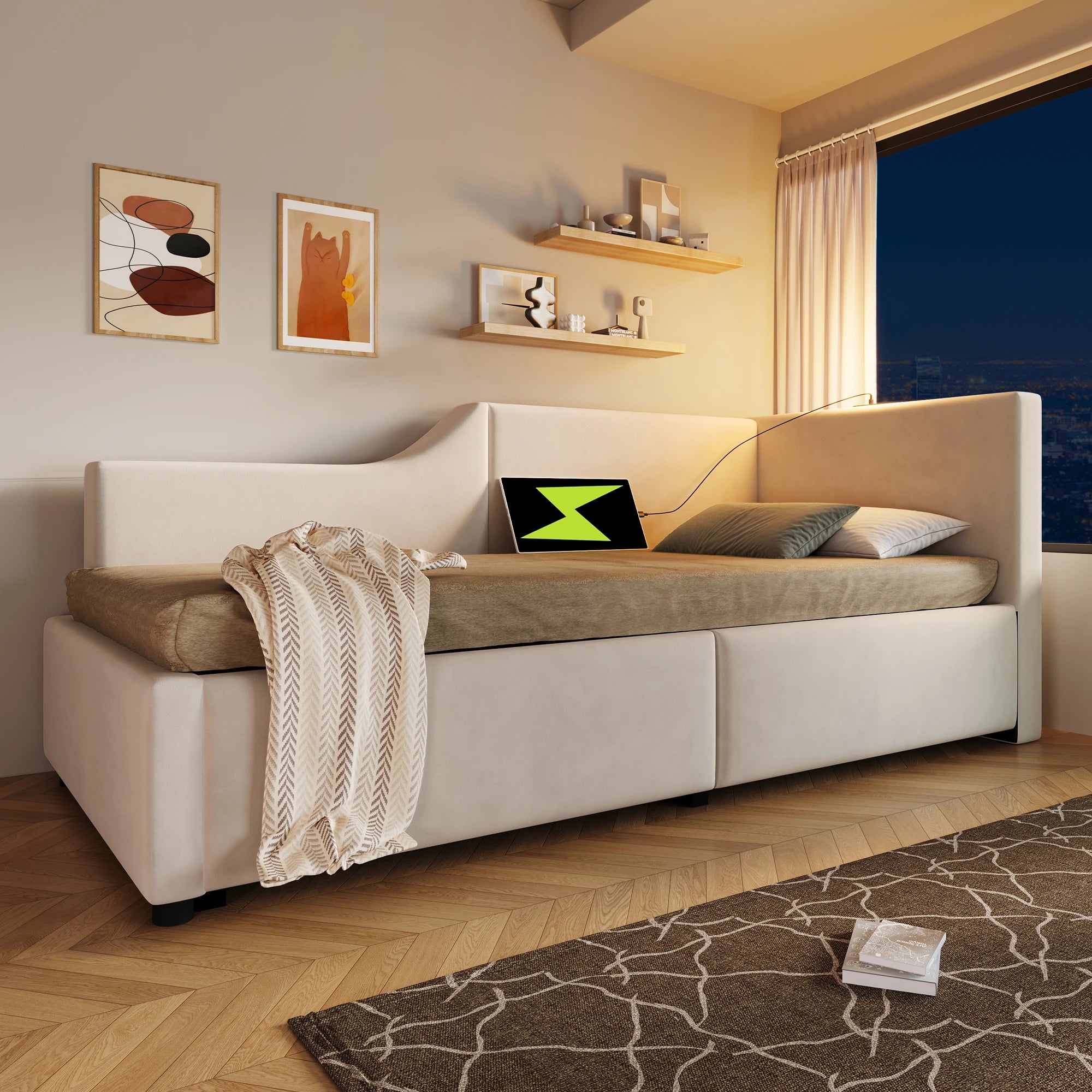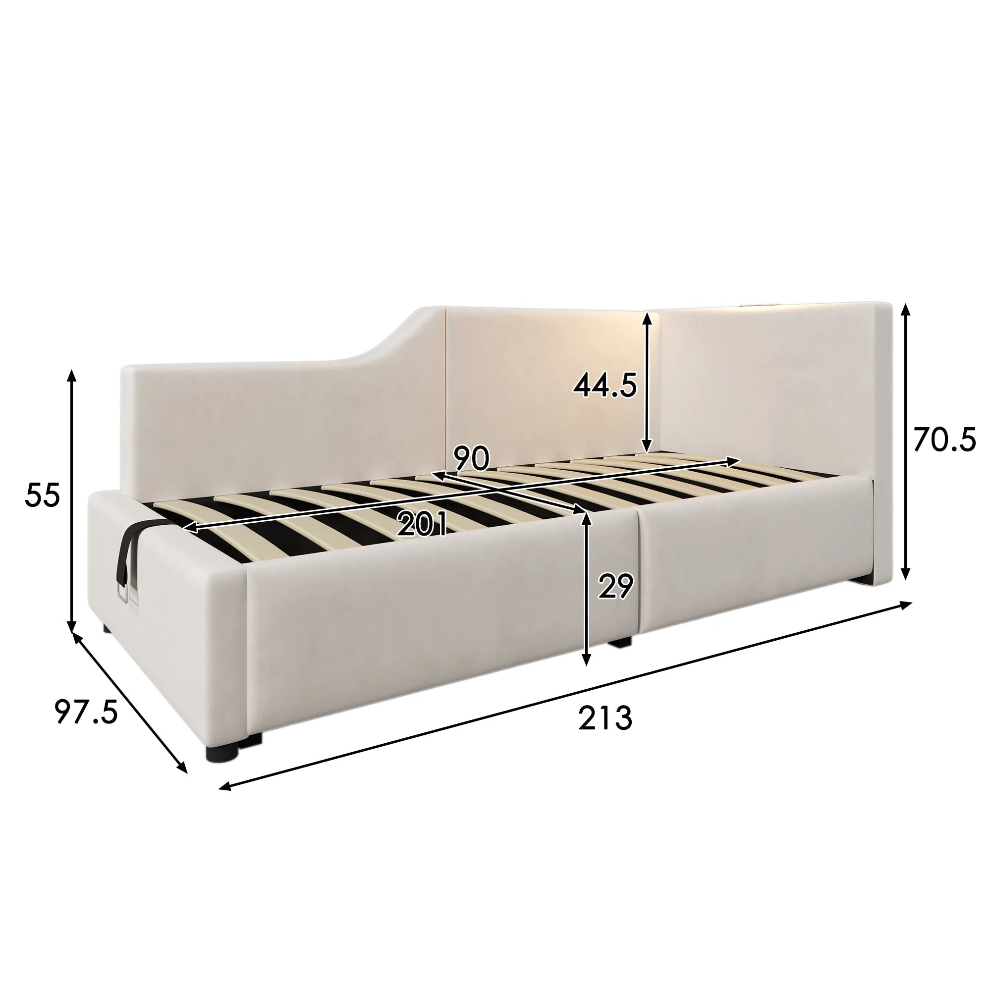 Lit coffre 1 place 90x200 avec rangement – Daybed velours avec lumière & USB-C Beige
