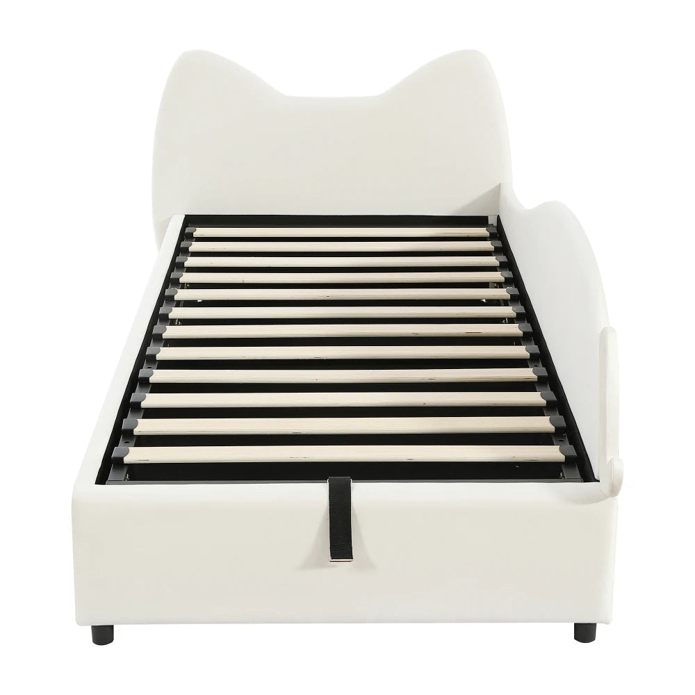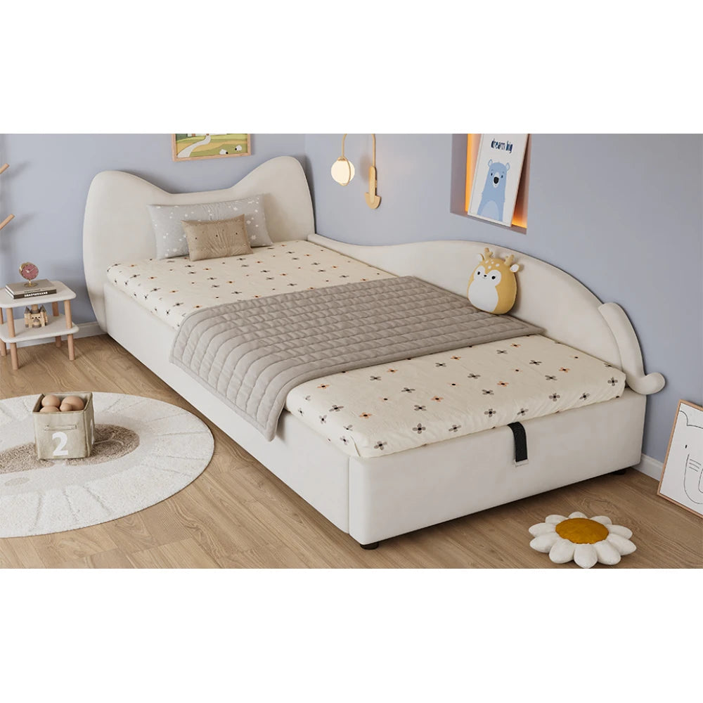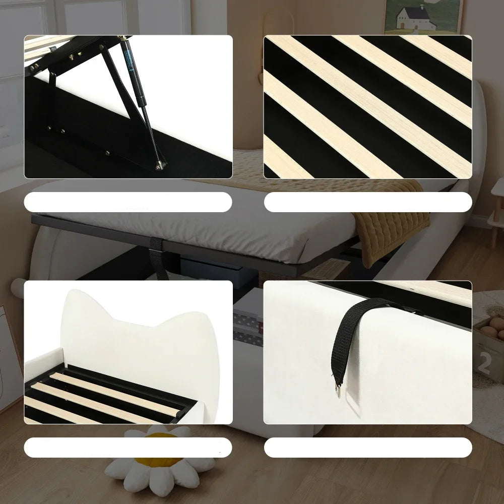 Le sommier à lattes intégré assure un soutien homogène adapté autant à un enfant qu’à une utilisation en lit coffre 1 personne adulte. Le velours beige apporte une texture douce et agréable, tandis que la forme “chat” du dossier crée une atmosphère rassurante et ludique dans une chambre.