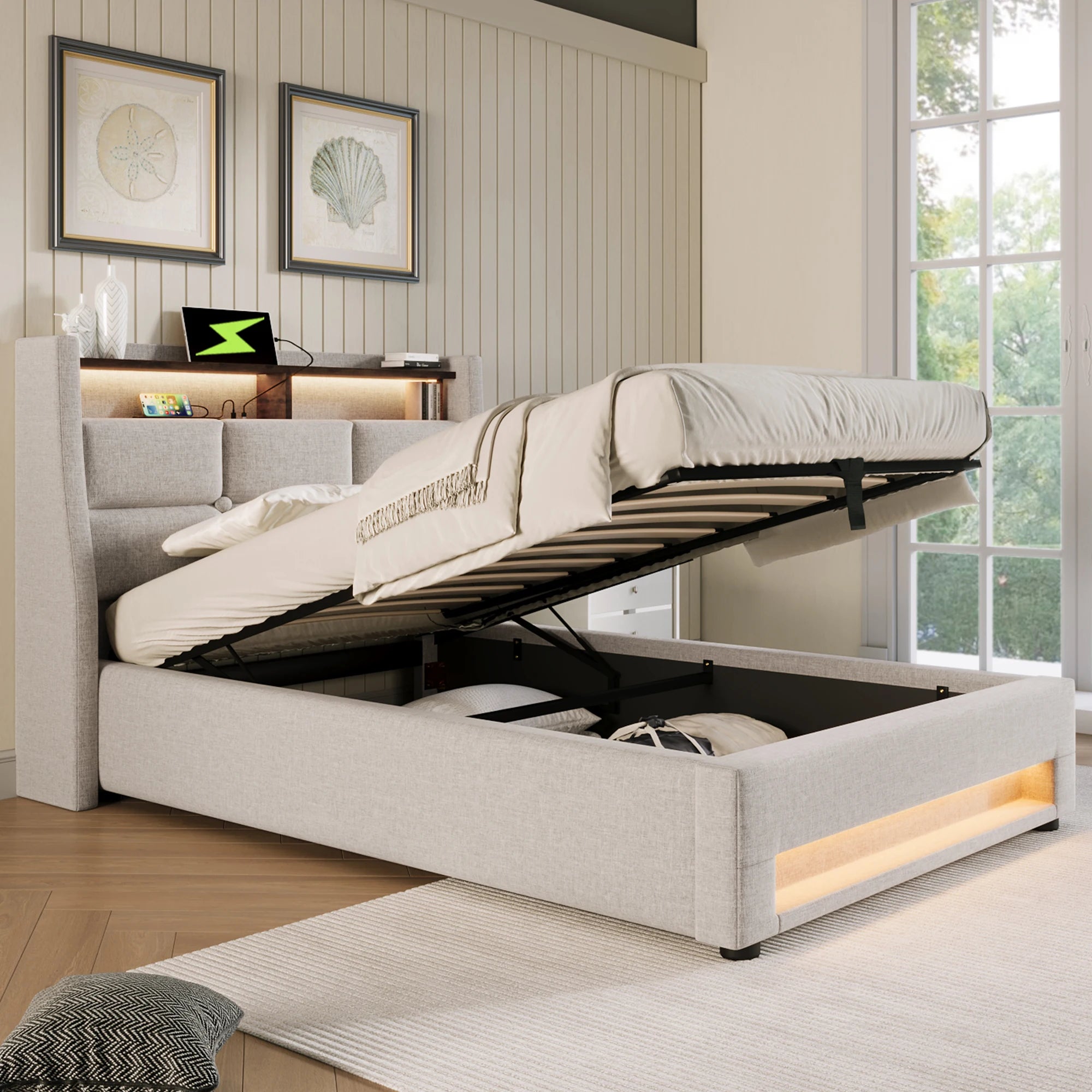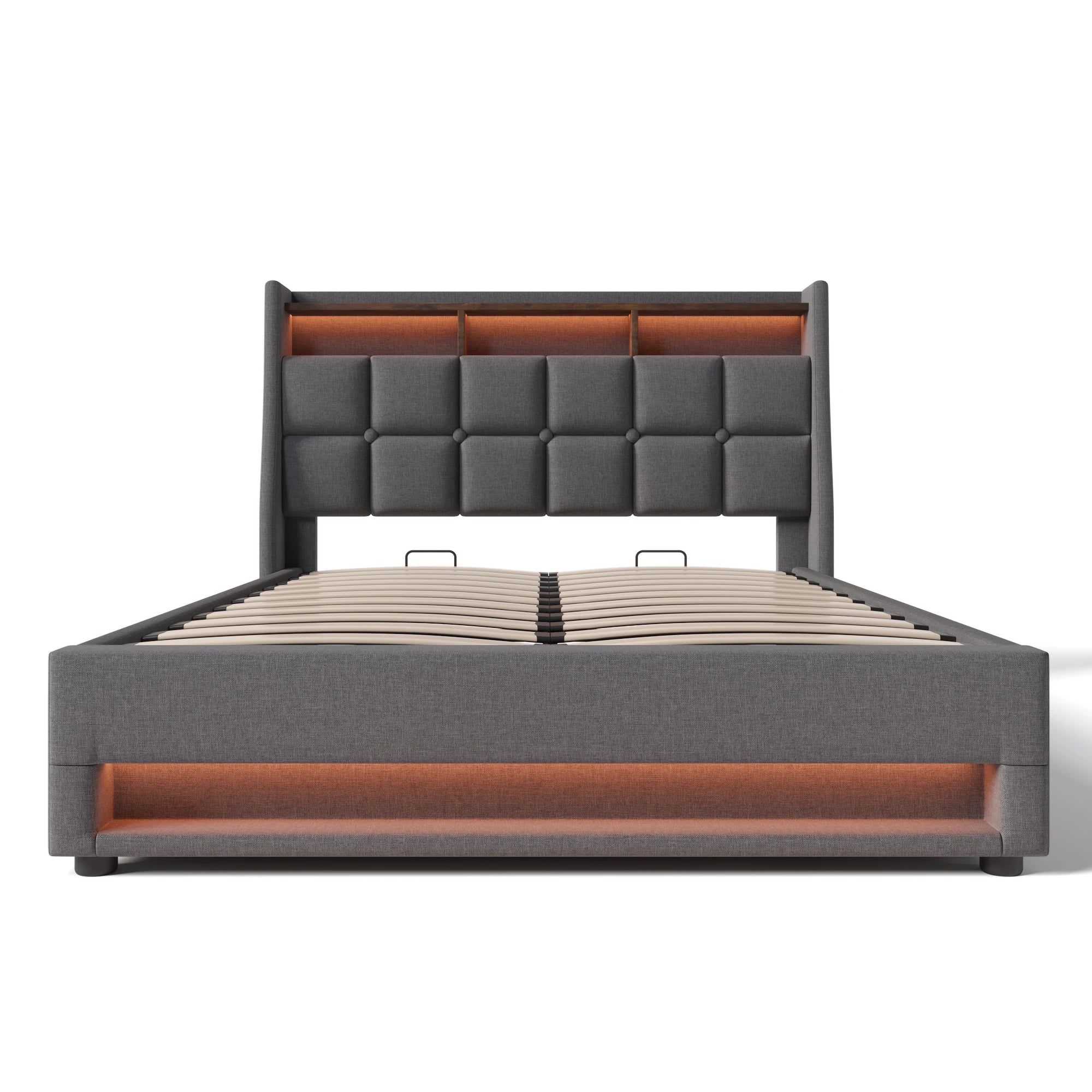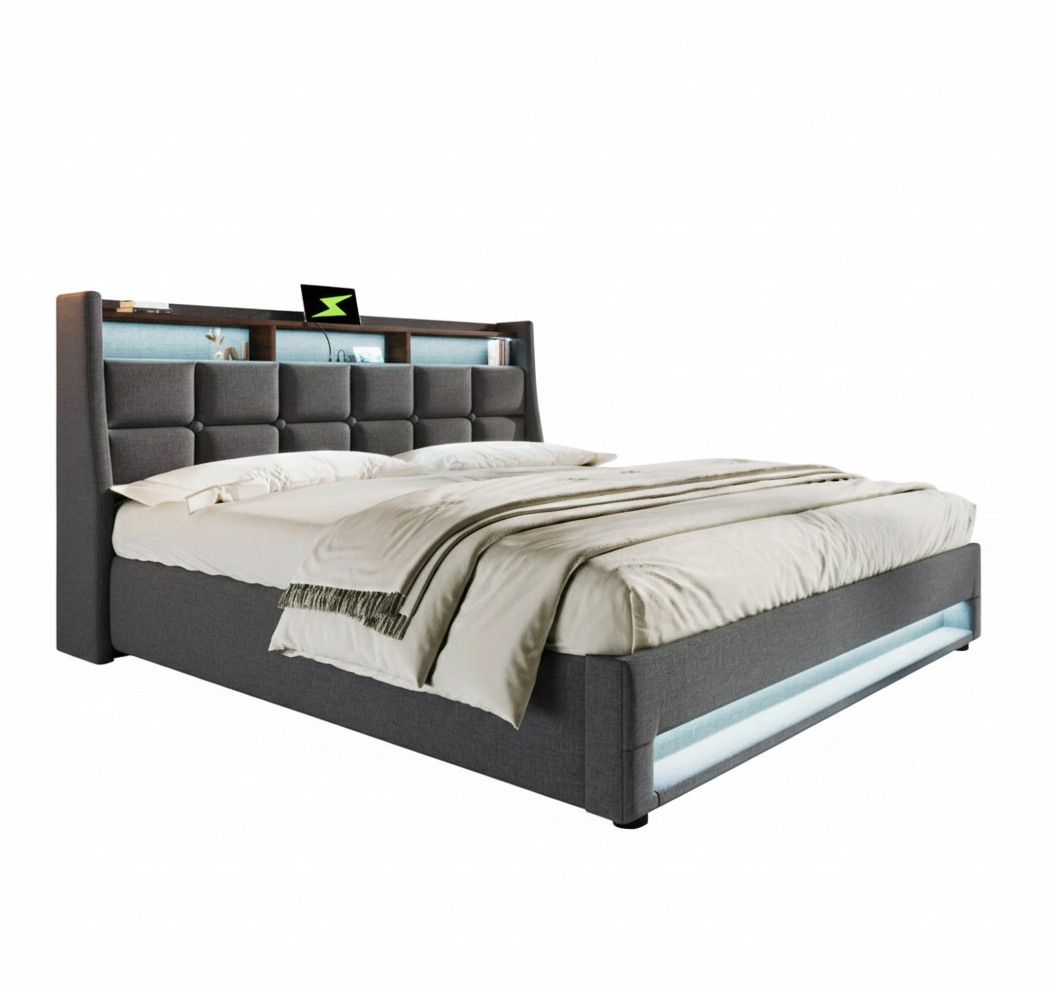 L’éclairage LED intégré dans la tête et le bas du lit apporte une lumière douce et personnalisable. Le port USB intégré à la tête de lit permet de recharger téléphone ou tablette sans multiplier les prises.