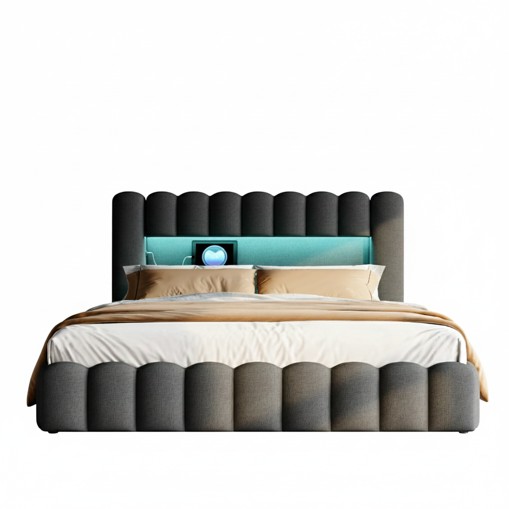 La tête de lit rembourrée intègre un bandeau LED réglable, permettant de créer une ambiance douce ou colorée selon l’humeur. Le port USB intégré offre un confort quotidien supplémentaire, idéal pour recharger un téléphone ou une tablette sans multiplier les câbles.