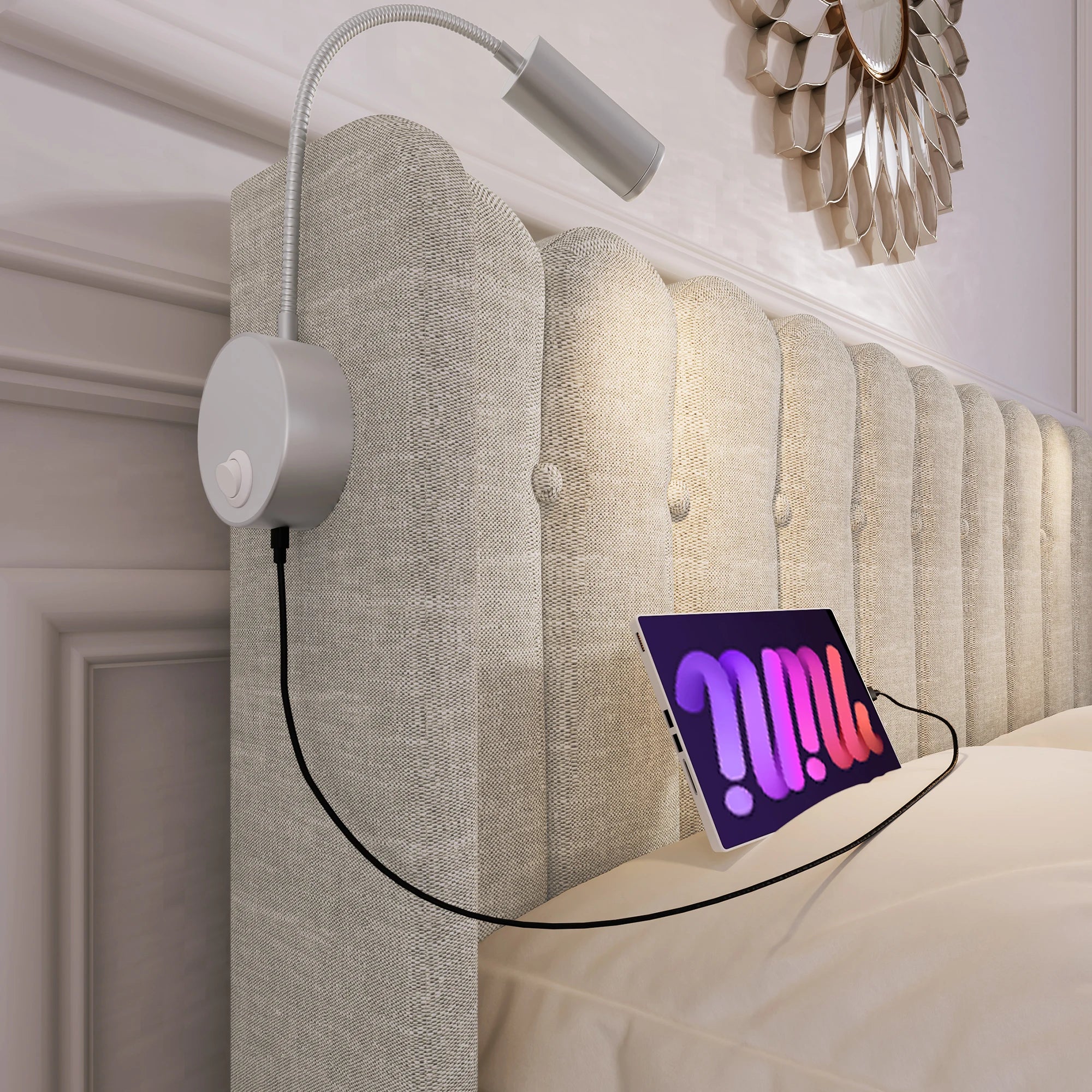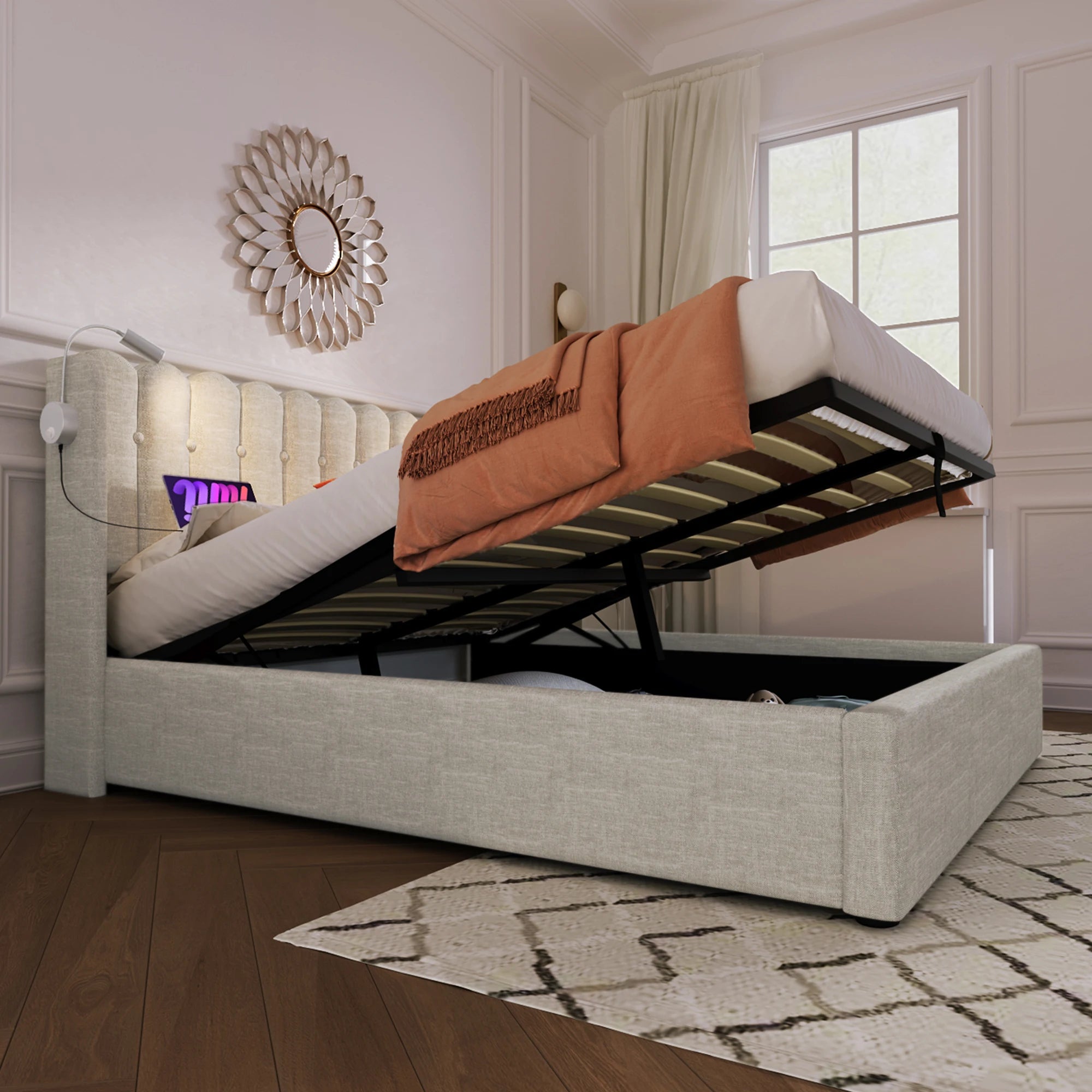 Lit coffre 2 places 160x200 avec rangement – Tissu beige avec lampe & USB