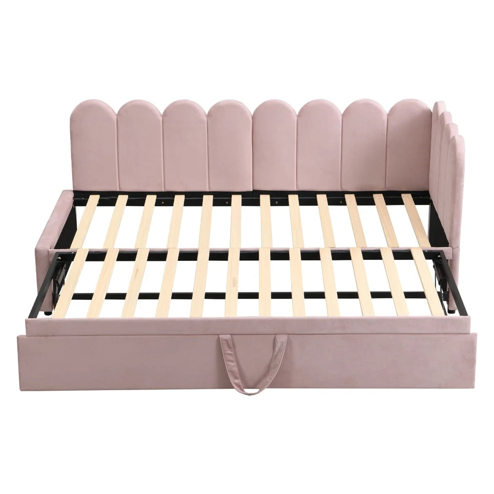 Le cadre en bois renforcé et la structure métallique du tiroir garantissent une bonne stabilité une fois le lit ouvert. Le velours apporte une sensation douce et chaleureuse, tandis que le dossier pétale ajoute un maintien confortable, que ce soit en position assise ou allongée. Le système extensible permet de passer facilement d’un lit 1 place adulte à un couchage plus large quand nécessaire.