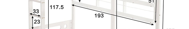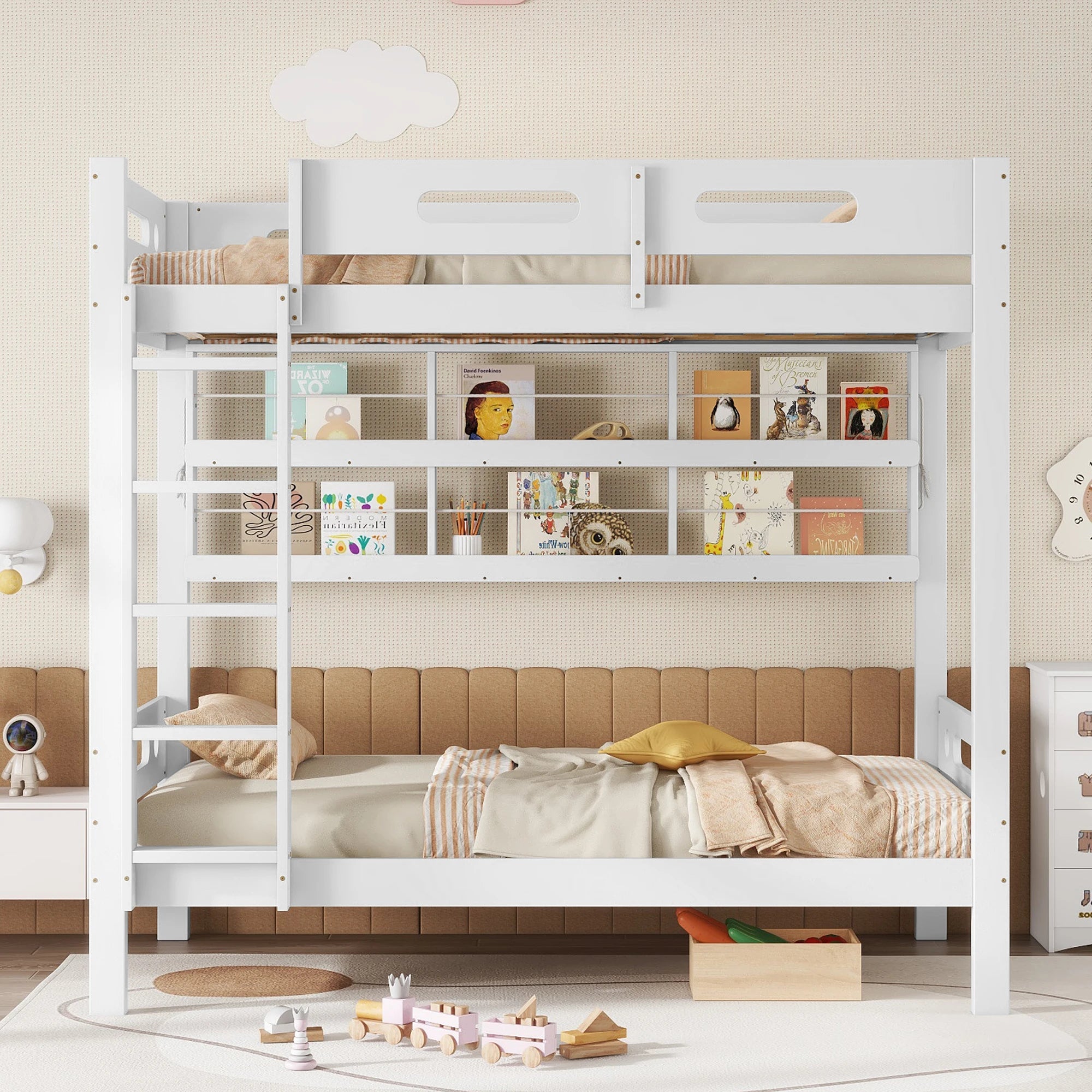 Sur toute la longueur du lit, une grande étagère ouverte permet de ranger livres, jouets, objets personnels et décorations. Cette configuration en fait un modèle idéal pour ceux cherchant un lit mezzanine avec rangement ou une solution compacte pour petite chambre. Son design blanc moderne s’intègre facilement dans toutes les décorations.