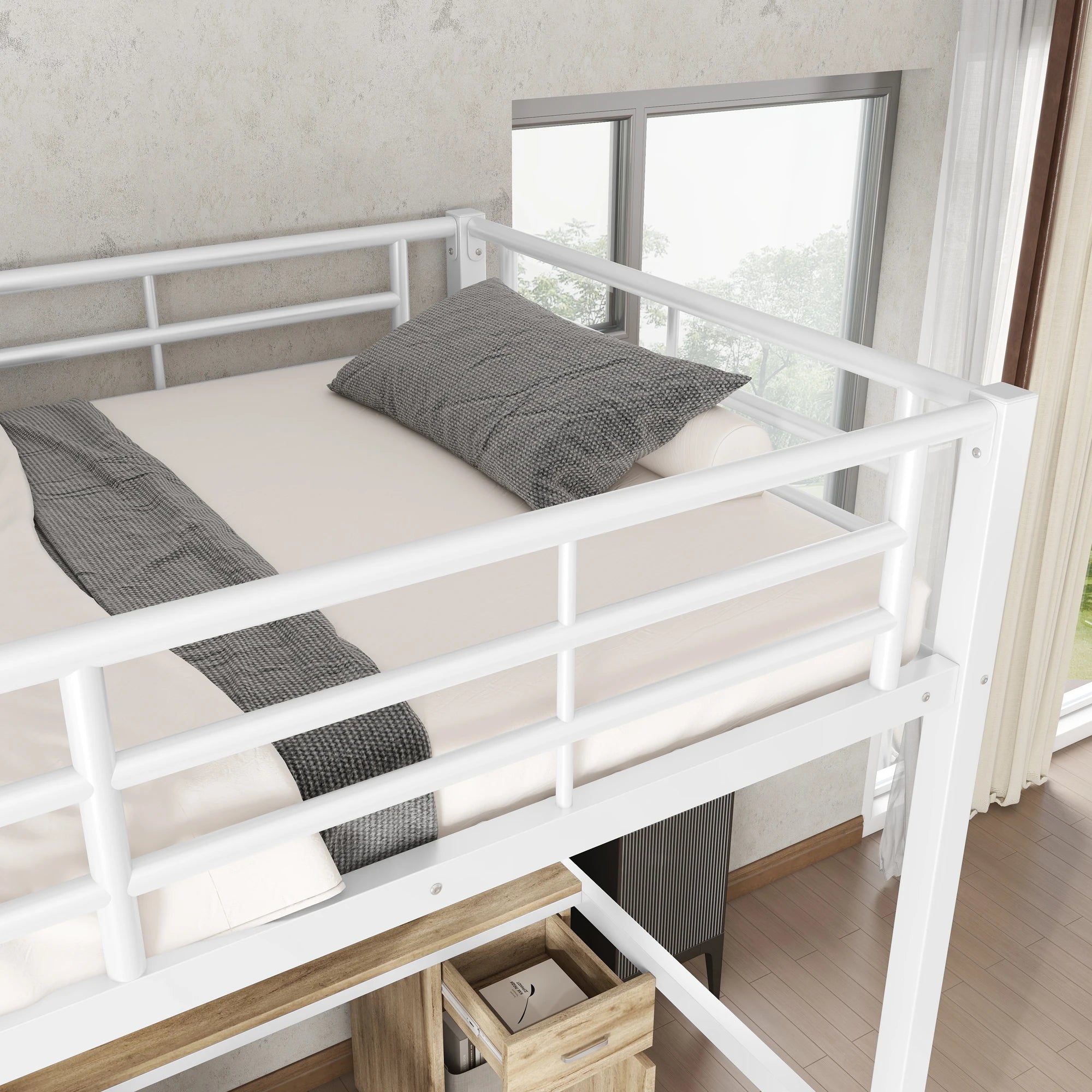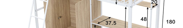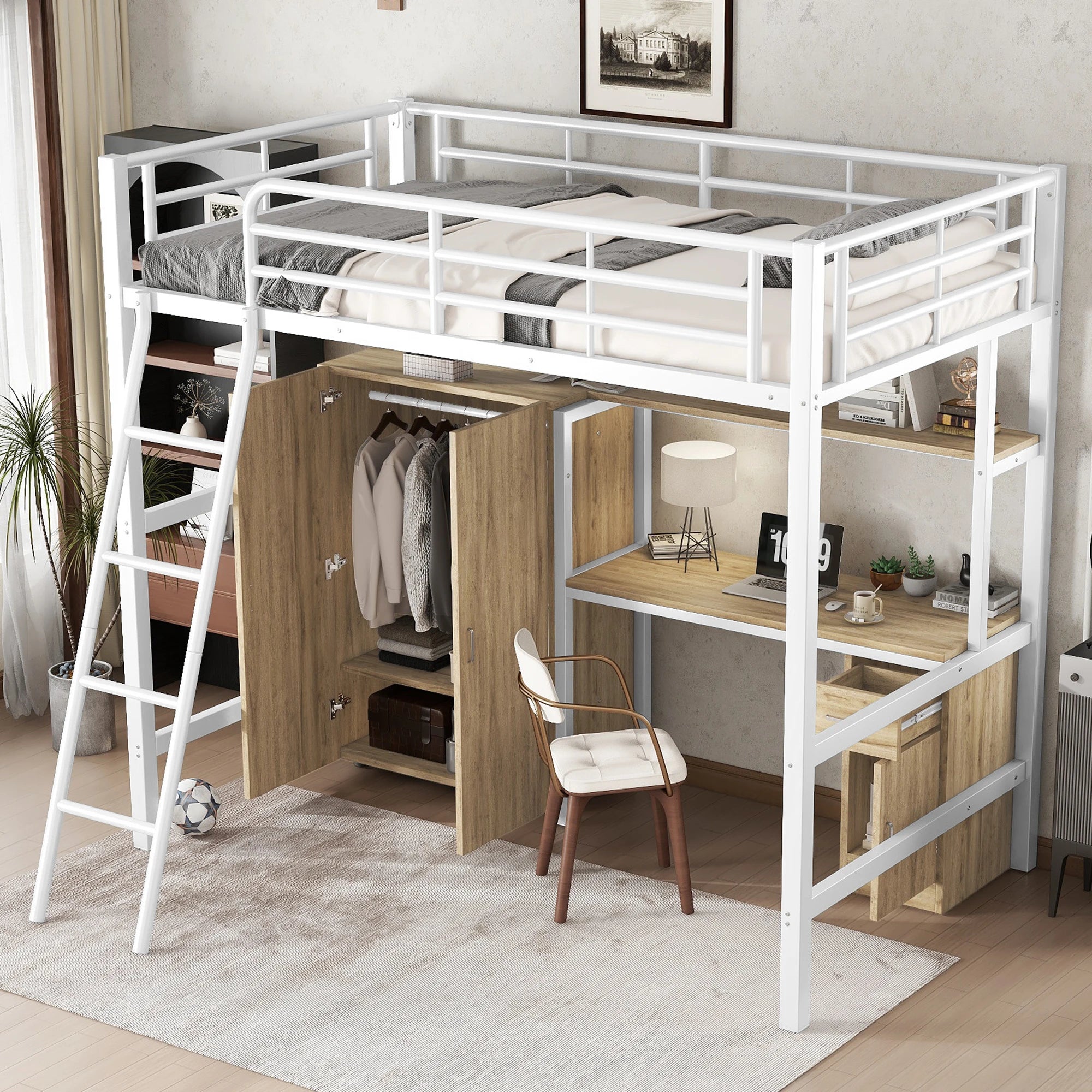 Lit mezzanine 1 place 90x200 – Métal blanc avec bureau, armoire et rangements