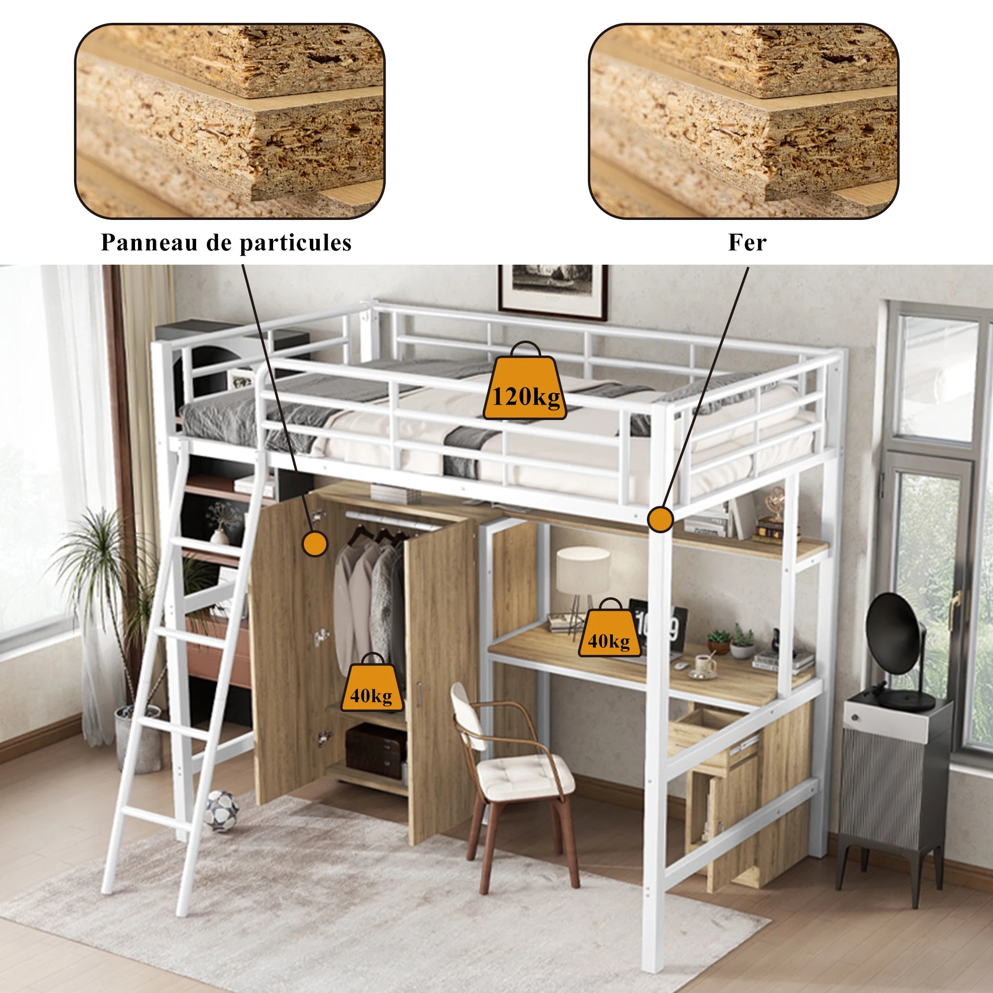 Un lit mezzanine complet avec bureau et rangement intégré pour transformer l’espace en zone de travail et de repos.